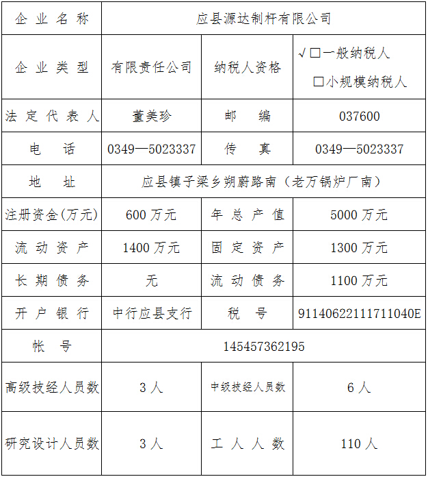 應(yīng)縣源達(dá)制桿有限公司是一九九四年五月建立2005年改制的股份合作企業(yè)?,F(xiàn)有職工110人 ,其中高中級(jí)專業(yè)工程師和技術(shù)員12名,高中文化程度以上86人,擁有成型、骨架、撥絲、攬拌、蒸養(yǎng)、修理六大車間,占地面積140000m2,檢驗(yàn)試驗(yàn)設(shè)備和儀器已達(dá)到一級(jí)試驗(yàn)室標(biāo)準(zhǔn)。公司總資產(chǎn)2900萬(wàn)元,年產(chǎn)值5000萬(wàn)元,年實(shí)現(xiàn)利稅600萬(wàn)元。